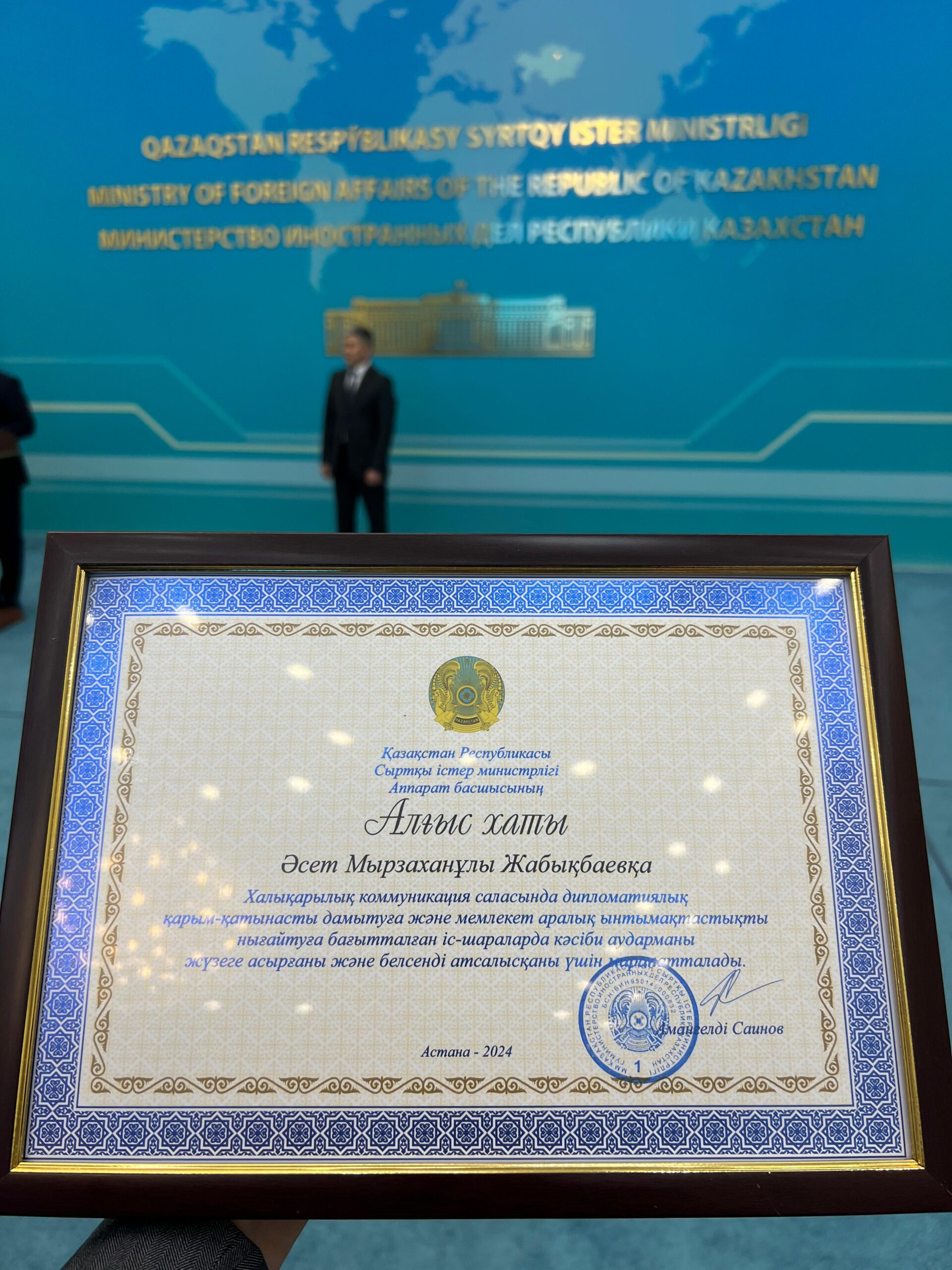 カザフスタンのパートナー会社 Megumi Corporation アセット社長が 外務省より日本国との友好と国交の発展に貢献している人物として表彰されました。